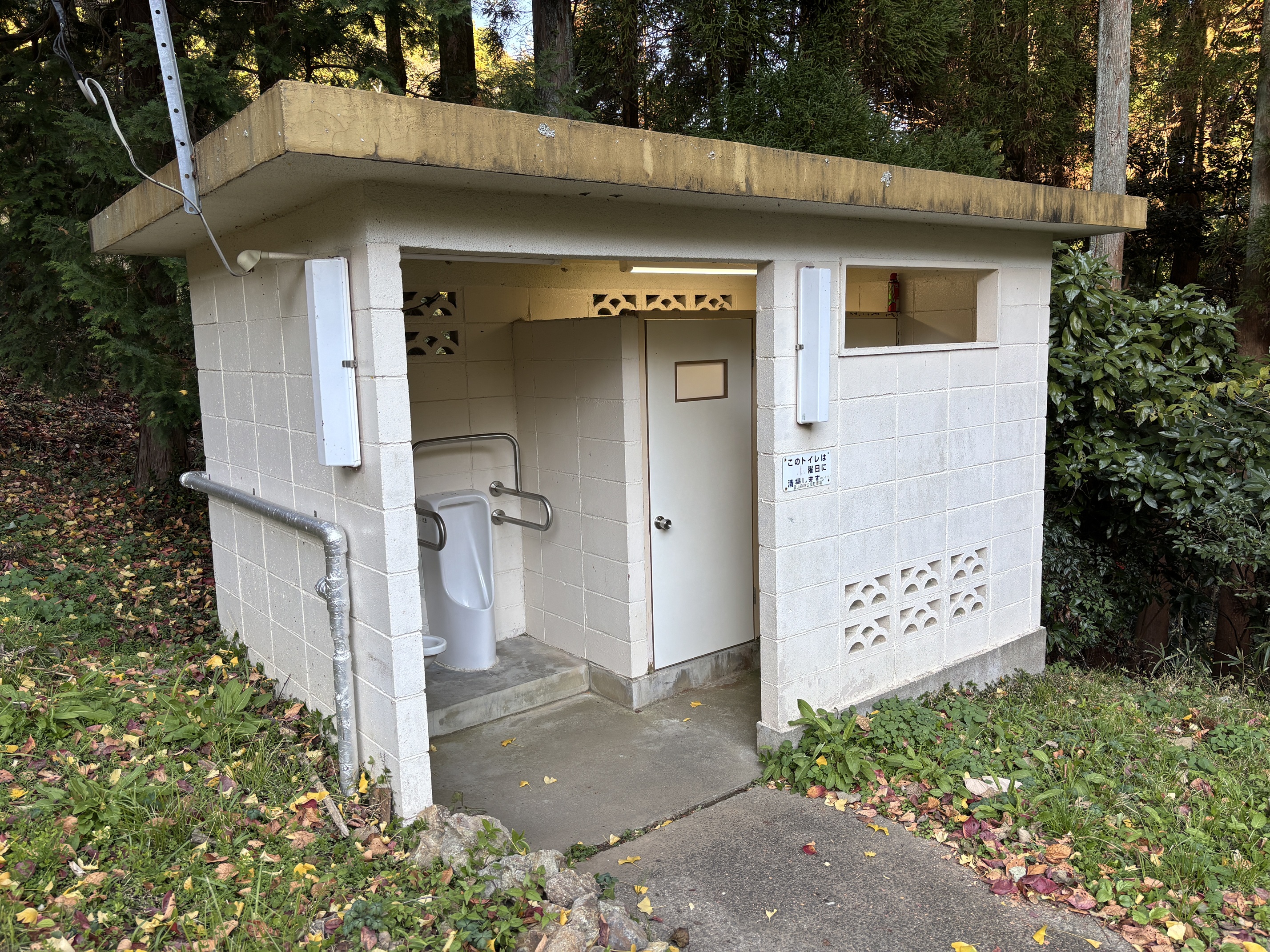 作業中は霊山寺駐車場スロープ下の水洗トイレをご利用ください。(写真を参照ください。)